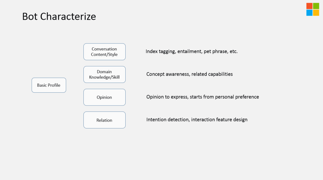 在我们内部机器人的基本特征如上,主要包括四部分:Conversation Content/Style、Domain Knowledge/Skill、Opinion、Relation。
