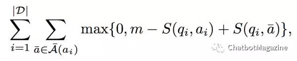 中的一个负样本(错误答案),m 是一个值为 0.1 的 margin。最小化这个损失函数,意味着我们希望正确答案和问题的得分要比任意错误答案的得分高出一个 margin。