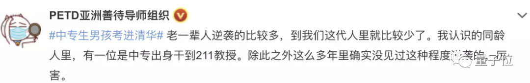 如微博大V“PETD亚洲善待导师组织”所说:老一辈逆袭的比较多,到我们这代人就比较少了。像他这样从中专到双非到全国NO.1医学院级别的逆袭真的多年难见。