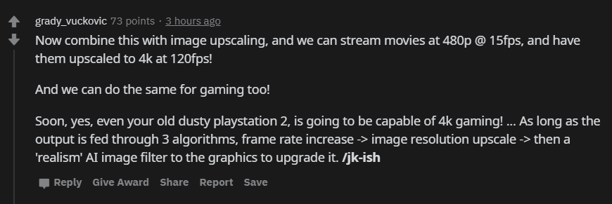 对于这种实时中间流估计算法,网友对其效果大加赞赏,并表示:「这种算法同样适用于游戏,很快老旧的 PS2 也能玩 4K 游戏了。」