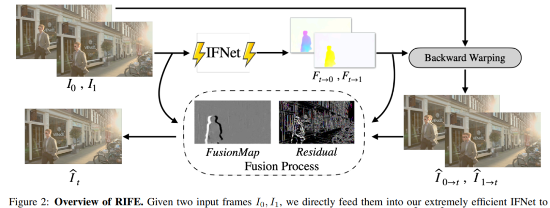 RIFE 包含两个主要组件,分别是利用 IFNet 进行高效的中间流估计和使用 FusionNet 时 warp 帧的融合过程。RIFE 的整体结构如下图 2 所示: