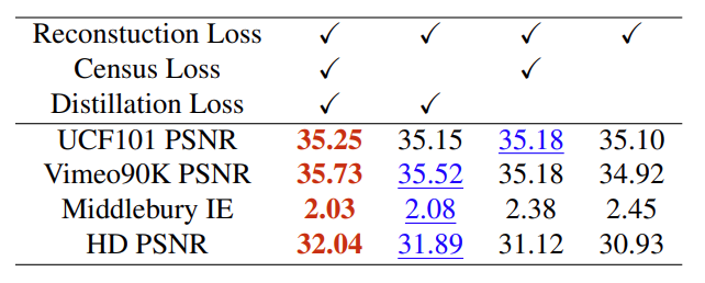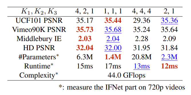 表 4:在 IFBlock 上不同的比例设置。IFNet 采用的是 (4, 2, 1) 设置, (1, 1, 1) 的组合只能在 UCF101 这种分辨率有限(256 × 256)的数据集上获得更好的性能。