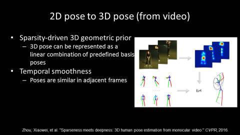 从视频来做三维姿态估计,应用到的很重要的点是,相邻帧之间的视觉信息应该是连续的,因而人的姿态在相邻帧之间的变化也会是连续的,因而可以利用这些信息的连贯性,来改进人体在3D或者2D中姿态识别的预测结果。