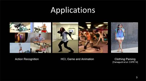 人体姿态识别有很多应用:比如行为识别、人机交互、游戏、动画以及衣服的识别等等。
