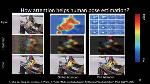 基于已有的网络结构,输入一张图片,获得一张热点图谱。通过热点图谱,我们得到一个预测结果。但是,在这个预测结果中,相对于这张图片,对人体膝盖或者脚踝的预测是错误的。这个时候我们可以引入注意力机制--注意力机制,是通过网络隐式学到的模型,会把我们的注意力集中在人体相关的红色区域。通过对这些相关区域进行人体姿态运动的预测识别,可以获得膝盖、腿和脚踝部位相对更准确的预测结果。同时,注意力机制不仅可以应用于整张图像或整个人体,也可以应用到人体的各个部位。通过对人体的各个部位设计不同的注意力机制特性,来得到更好的人体姿态预测结果。比如示例中,通过引入部位注意力机制,我们得到了更准确的人体脚踝位置的预测结果。