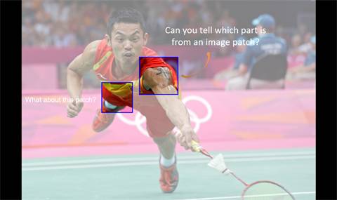 以上图标出的两个区域为例,如果不看全图的效果,仅根据局部的视觉信息,人眼是几乎无法识别出它们分别属于身体哪些部位的;而加上全图上下文信息之后,识别起来就容易得多。从这个例子我们可以看出,仅局部信息在人体姿态识别中是不够的,我们需要利用全局信息来为人体姿态识别提供辅助。