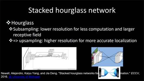 出于这种考虑,同时在深度学习与大数据引爆学术界的大背景下,如何针对人体姿态估计问题设计出专用网络结构成为了一个新兴研究方向。例如,来自密歇根大学的研究团队设计的Stacked hourglass network就是一种专门用于人体识别问题的网络结构。如图所示,这是一种沙漏型的网络结构,首先进行卷积处理,并进行下采样操作,获得一些分辨率较低的特征,从而使计算复杂度降低。为了使图像特征的分辨率上升,紧接着进行上采样。上采样操作使得图像的分辨率增高,同时更有能力预测物体的准确位置。通过这样一种处理,相较于其他网络,该网络结构能够使同一个神经元感知更多的上下文信息。