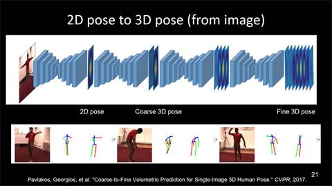 前文所讲,都是基于2D图片获得姿态预测结果,即我们得到的只是在图片中人体的2D位置的坐标(x,y)。然而,人是在3D世界中的真实存在,我们其实还可以获取另外一个维度的信息,即深度信息。现有研究结果表明,只从一个简单的RGB图像是可以获得图像的3D信息的。其方法如下:首先获得2D位置预测,通过堆叠沙漏型的网络结构,得到一个3D位置的初步、粗略的预测信息,再进一步堆叠网络结构进行精细化的处理,最终会得到一个非常精细的3D信息预测结果。