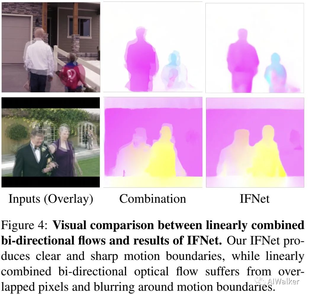 为更好说明IFNet的优势,看一下下图咯。这里对比了IFNet与LiteFlowNet的视觉效果对比,可以看到IFNet的光流更为清晰、锐利;同时线性组合后光流存在更少的重叠和模糊现象。