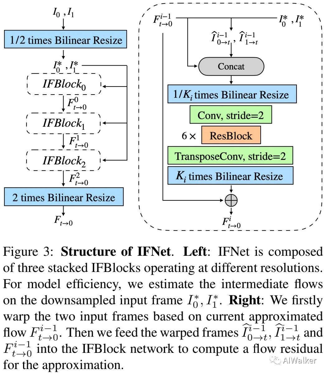 上图给出了IFNet的网络结构示意图,它的作用是根据两帧连续输入 预测中间流 。为更好处理大运动,IFNet采用了“Coarse-to-Fine”方式逐渐提升分辨率,也就是先在低分辨率上计算“粗糙”的光流,然后在高分辨率上计算“精细”光流。这也是目前光流估计中常用的一种处理方式。IFNet的这种光流估计方式可以描述如下:
