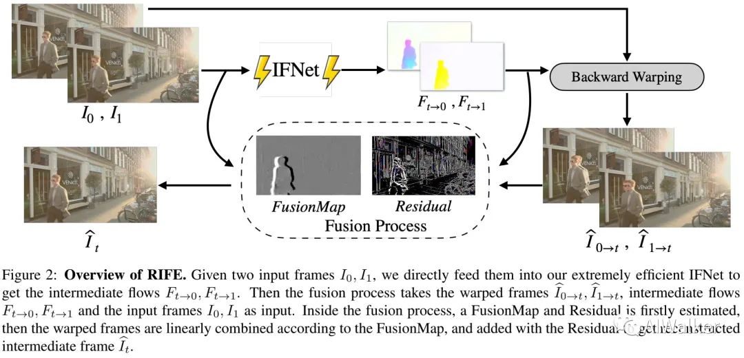 我们先简单介绍一下RIFE的大脉络。给定连续两帧RGB图像 ,视频插帧的目标是合成中间帧 。首先IFNet直接对输入帧估计中间流信息 ,然后采用线性运动假设估计 :