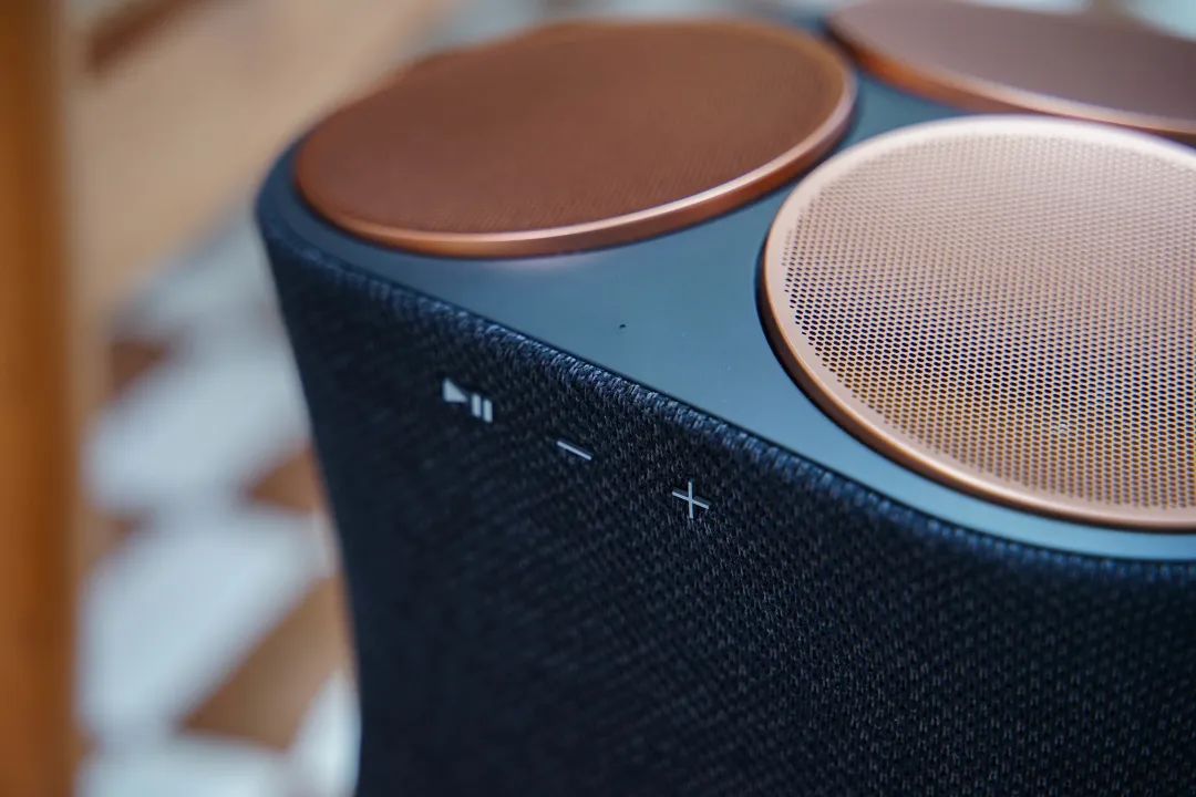 许多人初见这款音箱,相信都会被它特立独行的外观吸引住。上边三个圆形的发声模块配合内凹的腰部线条,的确没有比它更像剃须刀的东西了。但是它看上去并没有说起来那么的怪异,我反倒觉得 RA5000 算是深度诠释了「低调奢华」这一词汇。经典的黑金配色和流线型设计,摆在家里显得意外和谐不突兀,几乎无感的融入了家居场景。当然了,从它的「块头」也可以看出,其整体机身尺寸为 235 x 329 x 225 (mm),重量为 5kg,种种迹象表明,它并没有为“便携”做任何的考虑。