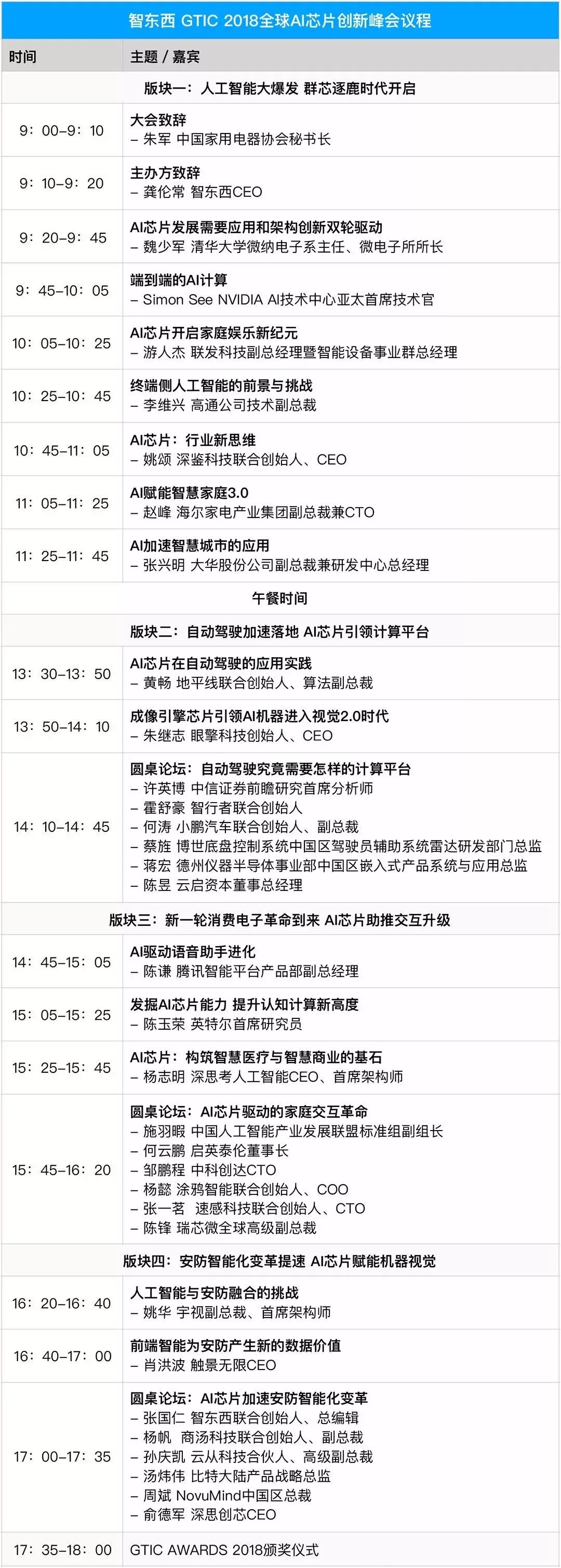 GTIC 2018分为上午场和下午场,将分为五个版块进行,上午为版块一“人工智能大爆发 群芯逐鹿时代开启”;下午的三个版块分别为“自动驾驶加速落地AI芯片引领计算平台”、“新一轮消费电子革命到来AI芯片助推交互升级”和“安防智能化变革提速AI芯片赋能机器视觉”。