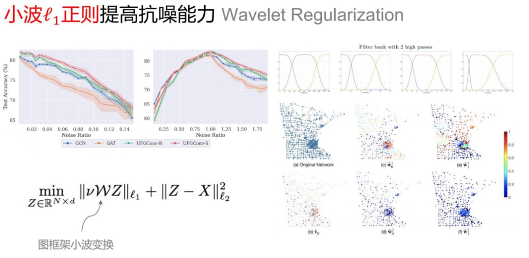 如果我们想设计更好的,具有更强的鲁棒性或者更好抗噪能力的 GNN,可以在正则化中再做一个更新,比如说引入一些小波变换、L1 正则等。事实上人们设计了一些具有多尺度多层分析能力的图卷积模块,并且引入了 Shrinkage 技术等对信号进行过滤、对数据进行压缩,这些在实践中都得到了比较好的验证。