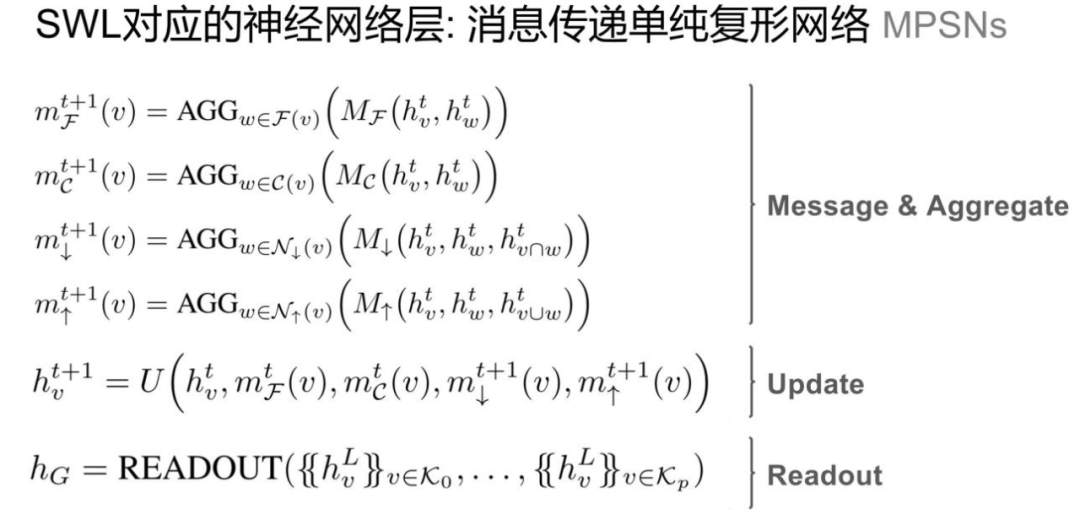 单纯复形网络和传统的消息传递模式很类似,只不过在传递的过程中不仅考虑了两个节点之间边的连接,还考虑了高阶结构(比如三角形或多边形)中的拓扑结构。把这些加入到消息传递模式中,就形成了单纯复形消息传递模式。