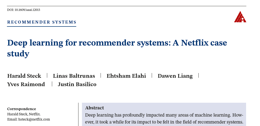 在2010年代初,深度学习在机器学习领域开始崭露头角,这得益于在计算机视觉、语音识别和自然语言处理(NLP)等不同领域的各种任务上取得的令人印象深刻的结果。当时,在推荐系统研究界有一种说法:深度学习的浪潮是否也会席卷推荐系统,从而带来巨大的改进?和其他许多人一样,我们netflix对这个问题以及深度学习改善推荐的潜力很感兴趣。虽然深度学习对于推荐系统的作用已经很明显了,但是要想了解深度学习在哪些方面比现有的推荐方法更有优势,却是一项艰巨的任务。这可以从这种方法在研究界获得关注花了多少年的时间得到证明。但这是一条有益的道路,随后有关这一主题的大量工作证明了这一点。我们自己对Netflix深度学习的研究也走了类似的道路: 最初的兴奋面对着需要精调方法的严酷现实。这使得我们对深度学习和其他推荐模型之间的关系有了更清晰的认识。当我们将这些方法的经验教训与不同深度学习方法所擅长的问题及其局限性相结合时,这些障碍就消失了。在此过程中,它还提供了如何让深度学习在现实世界的推荐设置中工作的实践经验。