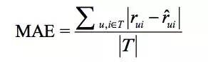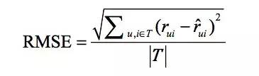预测用户对物品评分的行为称为评分预测,在评分预测中,预测准确度一般通过均方根误差RMSE 和 平均绝对误差MAE计算,对于测试集中的一个用户u和物品i,令rui是用户u对物品i的实际评分,而rˆui 是推荐算法给出的预测评分,那么RMSE的定义为: