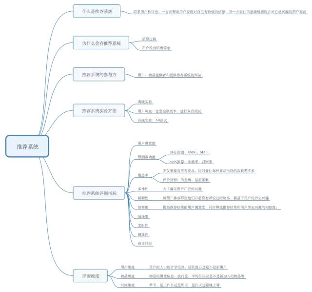 本节将介绍各种推荐系统的评测指标。这些评测指标可用于评价推荐系统各方面的性能。这 些指标有些可以定量计算,有些只能定性描述,有些可以通过离线实验计算,有些需要通过用户 调查获得,还有些只能在线评测。