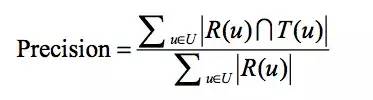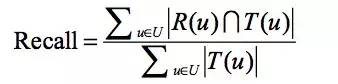 令R(u)是根据用户在训练集上的行为给用户作出的推荐列表,而T(u)是用户在测试集上的行为列表。那么,推荐结果的召回率定义为: