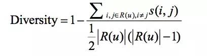 多样性描述了推荐列表中物品两两之间的不相似性。因此,多样性和相似性是对应的。假设s(i, j) ∈[0,1] 定义了物品i和j之间的相似度,那么用户u的推荐列表R(u)的多样性定义如下: