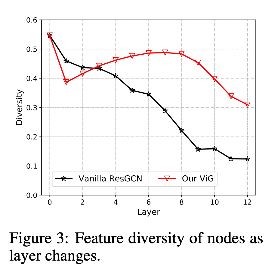 由 Grapher 模块和 FFN 模块叠加而成的 ViG 块是构成网络的基本构建单元。因此构建面向视觉任务的 ViG 网络。与 ResGCN 相比,ViG 随着层的深入能够保持特征多样性,学习出判别性的表征。
