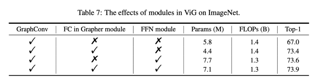 各向同性架构意味着主体在整个网络中具有大小和形状相同的特征,如 ViT 和 ResMLP。本文构建了三种不同模型尺寸的各向同性 ViG 架构,分别为 ViG-ti、S 和 B,节点数设为 N =196。为了逐渐扩大接收场,这三种模型中随着层深的增加,邻居节点数 K 从 9 线性增加到 18。头的数量默认设置为 h = 4。