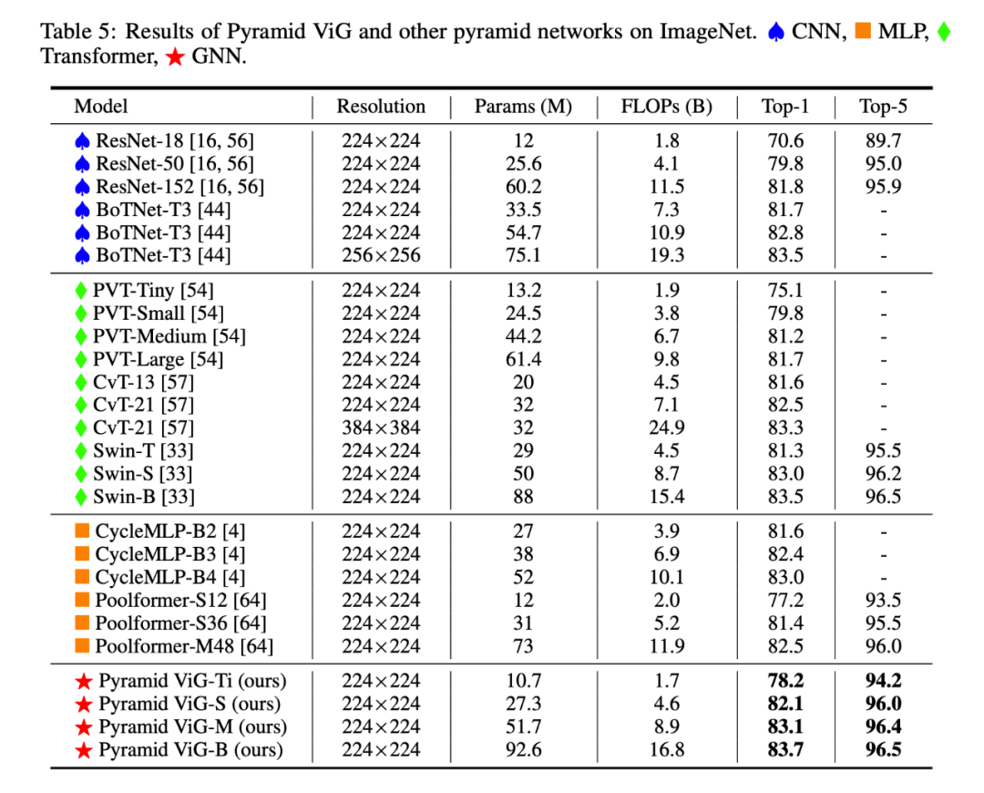 因此,本文基于图像的图表示(graph representation)提出了 vision graph neural network (ViG)。本文应该是首次将图神经网络用于视觉任务,同时能取得很好的效果,在 ImageNet 分类任务上超过了 CNN (ResNet), MLP (CycleMLP) 和 transformer (Swin-T) 。