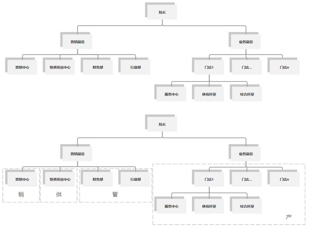 在划分之前,可以先绘制出与其相关的组织架构图,然后根据组织/部门之间的关系,划分出各个业务子模块即可,部门职能最典型的是产(生产/产出)、销(销售)、供(供给/供应)、管(管理)四部分。