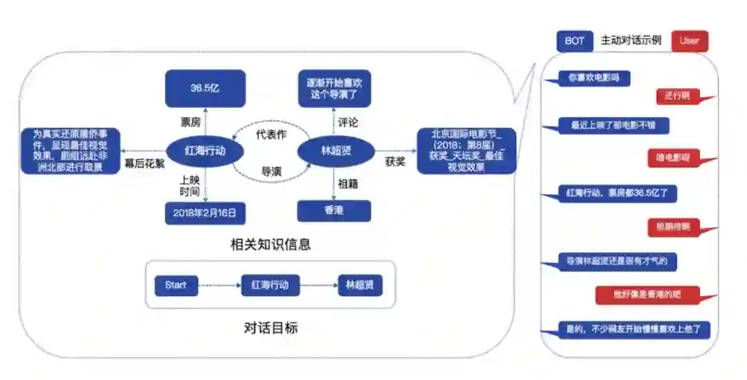 如图1左上部分所示,给机器提供的是聊天相关的背景知识。图1右侧为主动对话示例,机器主动发起对话,根据背景知识主动引领对话进程,自然流畅的实现话题的迁移目标。