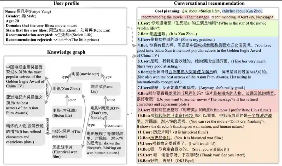 研究人员要求两人进行对话,其中一人扮演recommendation seeker(用户),另一个人扮演recommender(bot),要求recommender主动引导对话,然后基于用户profile推荐,而不是用户引导对话或寻求推荐。例如在用户关于『生死劫』的问答后,机器根据其长期偏好和知识图谱信息,规划对话目标序列(关于『周迅』的闲聊>>推荐电影『风声』),并自然地引导对话,当用户转移话题(更喜欢『刘若英』的电影),机器根据其profile,精准推荐『南京1937』,最终完成所有对话目标。对话结束后,用户profile会根据其反馈而更新,以便于提高后续对话的用户体验。