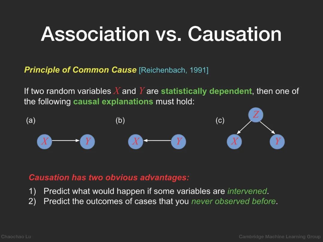 然而,目前成功应用于上述医疗问题的方法仅仅是基于关联而不是因果关系。在统计学中,人们普遍认为关联在逻辑上并不意味着因果关系[10,12]。关联与因果之间的关系由莱辛巴赫·[14]将其形式化为著名的共同原因原理:如果两个随机变量{X}和{Y}在统计学上是相互依存的,那么下面的一个因果解释必须成立:a) {X}导致{Y};b) {Y}导致{X};c)存在一个随机变量{Z},它是引起{X}和{Y}的共同原因。因此,与关联相比,因果关系更进一步,探索变量之间更本质的关系。因果推理的中心任务是揭示不同变量之间的因果关系。理解一个系统的因果结构将使我们具备以下能力:(1)预测如果某些变量被干预会发生什么;(2)评估影响干预及其结果[9]的混杂因素的影响;(3)使我们能够预测以前从未观察到的情况的结果。如果我们将医学中的治疗视为干预,将治疗效果视为结果(例如,理解药物对患者健康的影响,评估未观察到的混杂因素对治疗和患者总体福祉的影响,评估患者疾病的不同治疗的存活率,等等),这些能力正是医疗保健所需要的,但大多数现有的方法尚未具备。这就是为什么因果关系在开发真正智能的医疗保健算法中扮演着关键角色。
