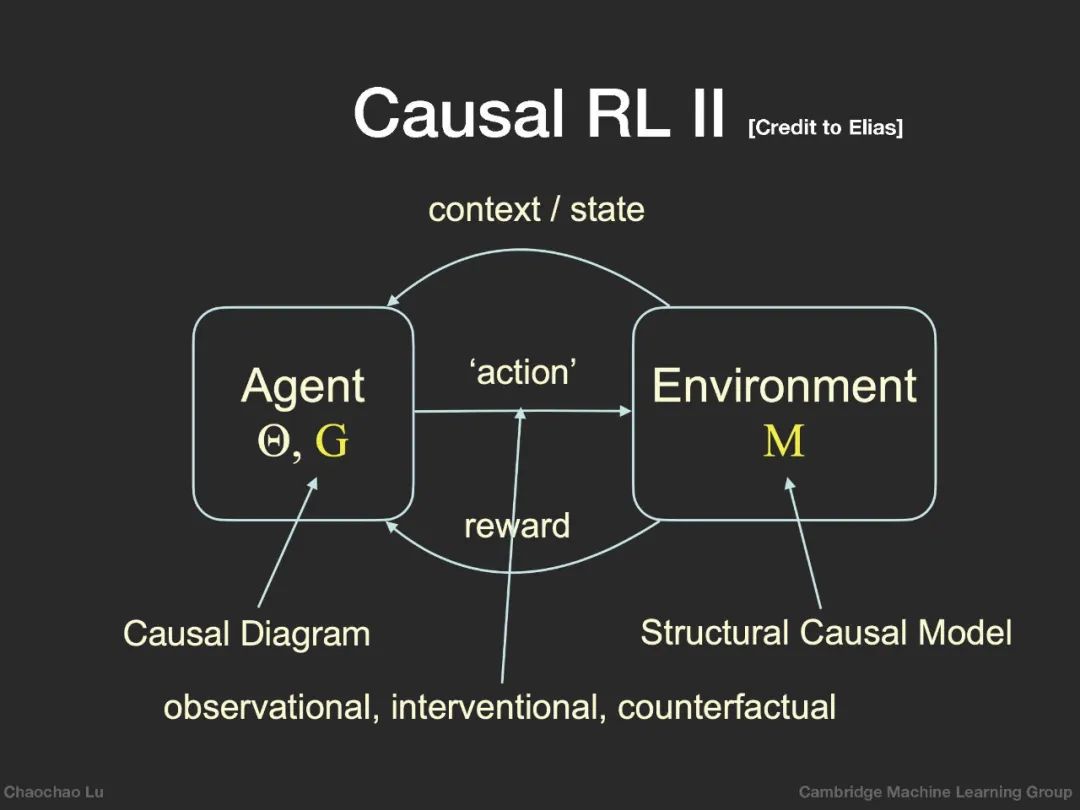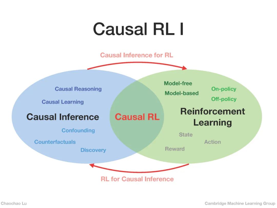 在因果推理中实施干预概念的一个自然想法是利用RL中的动作概念[17,2]。更具体地说,agent可以根据其当前状态,通过采取不同的行动(干预)来观察环境状态的变化,并获得即时的回报(结果)。然而,agent的目标是最大化预期累积报酬,这表明RL本身不具备进行因果推理的能力。因此,因果推理通过推断状态之间或状态与动作之间的因果关系,如减少状态或动作空间,处理混淆,进而帮助RL更高效、更有效地学习价值函数或策略。可见因果关系与强化学习是互补的,可以从因果关系的角度加以整合,从而促进两者的发展。