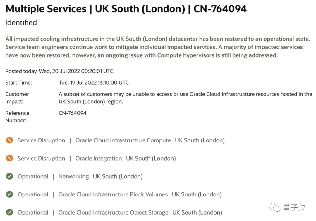 甲骨文在伦敦的数据中心也是如此,虽然出故障的冷却设施已重新运行,大多数受影响的服务已恢复,不过计算管理程序的一个问题仍在处理中。