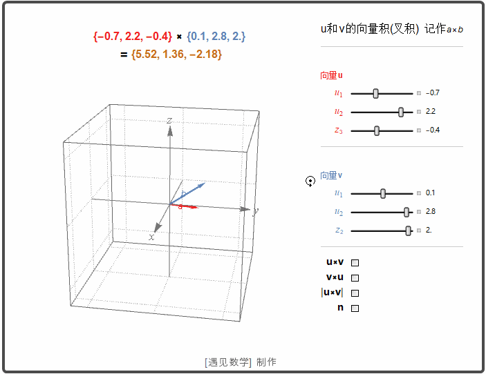 空间两个非零向量 u 和 v. 如果 u 和 v 不平行, 那么就确定了一个平面. 这样可以用右手法则选择一个垂直于这个平面的单位向量 n. |u×v| 是平行四边形的面积.