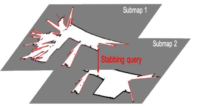 图3:执行穿刺查询。根据世界坐标系中两个子图的姿态,可以计算出子图1中每个局部边界点在子图2中的对应位置。如果子图1中的局部边界点仍然是子图2中的局部边界点或未知点,则将此边界点视为全局边界点(例如,全局图仅由两个子图组成)。否则表示此边界点在子图2中被遮挡。对子图2中的局部边界点执行相同的查询操作。