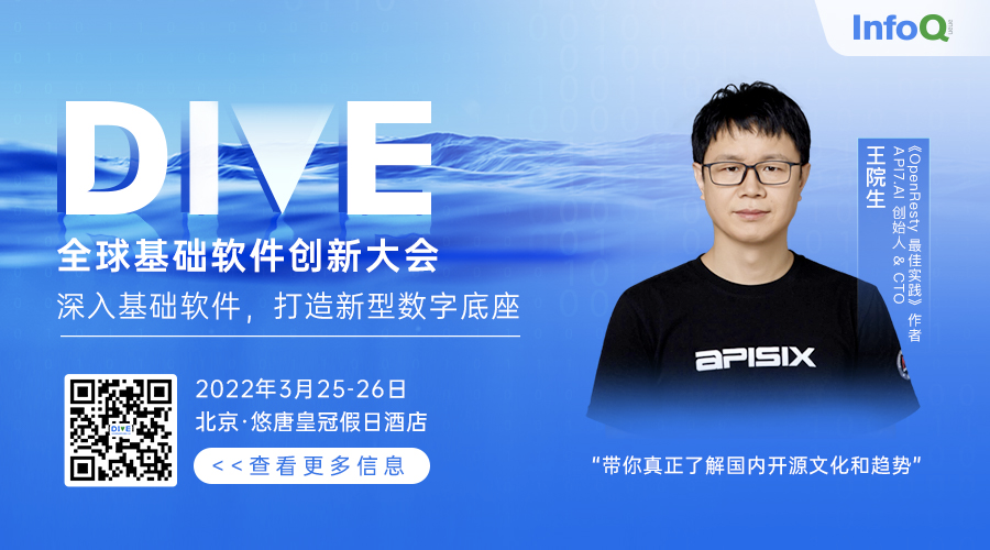 3 月 26 日,王院生将于 DIVE 全球基础软件创新大会的《基础软件人才培养和发展》专题中,带来“开源浪潮下基础软件人才培养和实践”的分享。希望借本次分享,能透过 Apache APISIX 开源项目的视角,系统阐述开源项目与基础软件人才的关系以及成长模式,让观众从实例中了解如何进行公开透明的全球协作,以及如何培养和吸引人才。“开源项目没有黑魔法,只有解决实际生产问题才有根基。”