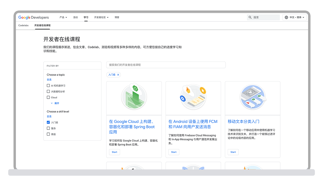 谷歌希望陪伴开发者不断学习成长,持续更新 Google 开发者在线课程,为开发者提供多元丰富的学习课程,助你不断扩充知识储备,提升多种开发技能。