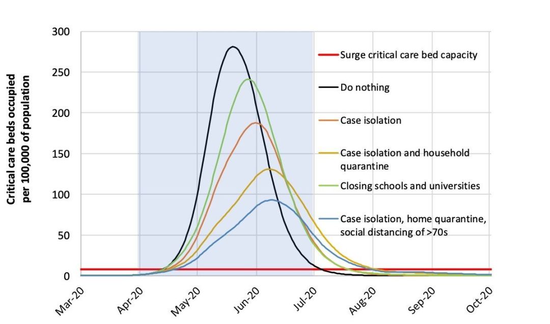 在研究人员的模型中,这是无效的。他们指出,如果不对整个人群采取相应的社交禁令,即使是隔离重症患者和老人、关闭学校,这些同样将导致感染人数激增,最终感染的人数会达到英美医疗系统所能承受的8倍。