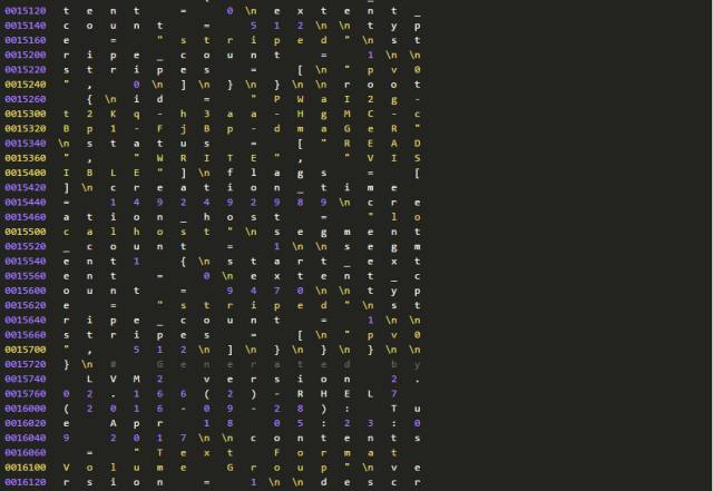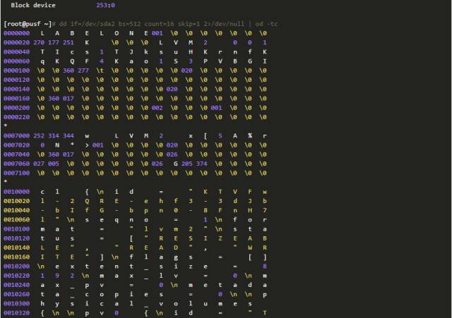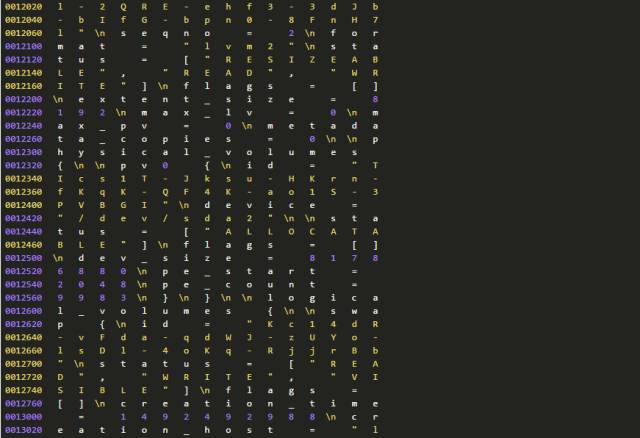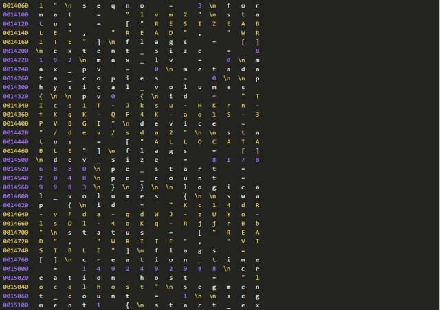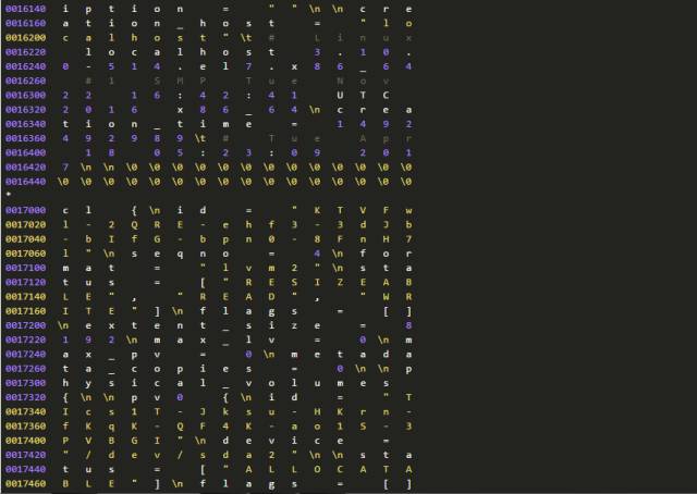因为种种原因,我们不能确认分区信息和LVM备份数据为何不一致。但是,我们可以进一步从磁盘上提取、分析数据。因为有关分区的元数据在(分区在),所以我们进一步检查磁盘上还有没有有关LVM的元数据?这只要使用下面的命令行