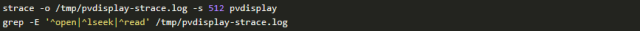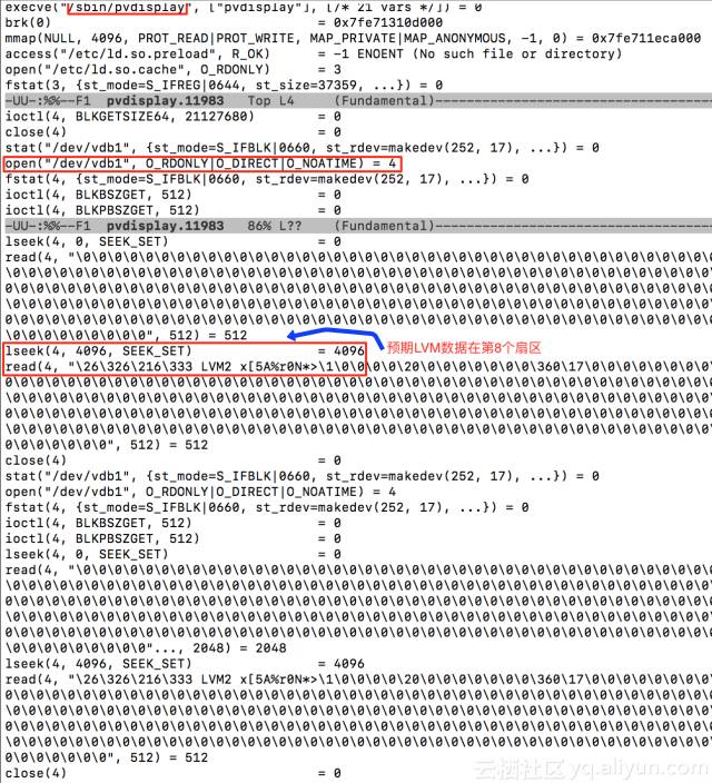 我们组合使用strace和grep命令来确认系统默认的LVM物理卷位置。如果你没有耐心分析下面的数据,请跳过直接看后面的截图