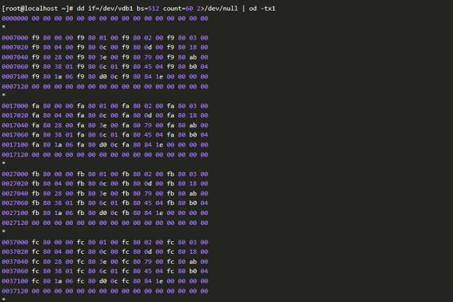 当然,也可以通过抽样检查来确认。这种方法通常是检查磁盘分区的前面一部分扇区。比如,下面的例子,通过检查前面几十个扇区,我们可以确认磁盘上确有数据。