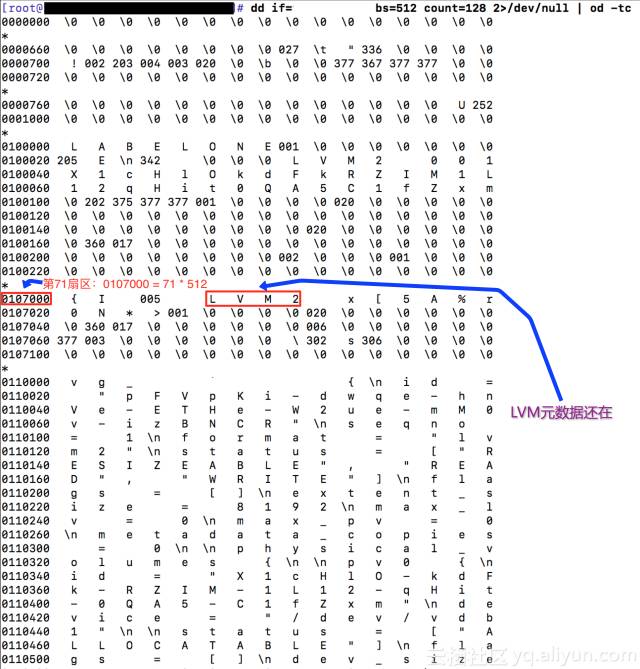 很明显,系统预期LVM元数据是在分区的第8个扇区,但是在需要做数据恢复的磁盘上,LVM的元数据却是在第71个扇区,而分区的起始扇区是2048,因此,LVM数据根本不在分区内。这就是为什么磁盘上还有LVM元数据,系统却没有识别出来LVM的原因。