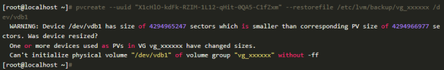 看样子,分区的数据有些地方出错了。根据上面命令报错的信息,对比LVM的备份数据和分区数据,很快我们就发现了问题。现有分区记录的其拥有的扇区数目,少于其上LVM卷组记录的扇区数量。