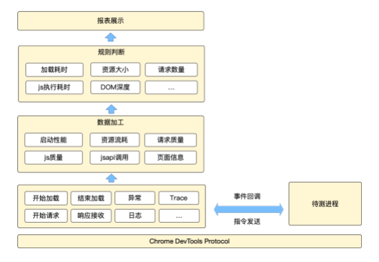 具体的实现方案,就是将 Soloπ 与待测应用建立基于 CDP 协议建立 Websocket 通信,监听页面发起请求、接收数据、开始加载等事件的回调、并收集报错、Trace 等数据。再按照启动性能、资源流耗、请求质量、JS 质量、 JSAPI 调用情况与页面信息 6 大维度进行数据的分类和整理,随后通过内置的规则对采集到的结果进行判断,最终生成报表并在界面中展示。