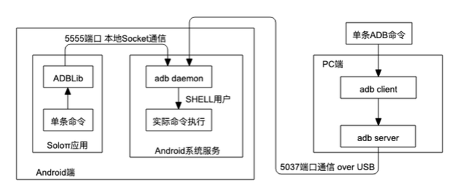 在 PC 上,通过 Android SDK 提供的ADB client 与同样运行于 PC 中的 ADB server 通信,再由 ADB server 通过 USB 与位于设备中的 Adbd 通信。要实现一套无线化的方案,必须要摆脱对 USB 线的依赖。好在 Android 系统还提供了一种基于 Socket 的 ADB 连接模式,既然是这样,那么只需要按照 ADB 通信协议在端上与本机的 5555 端口进行通信即可获得 ADB shell 的执行能力。