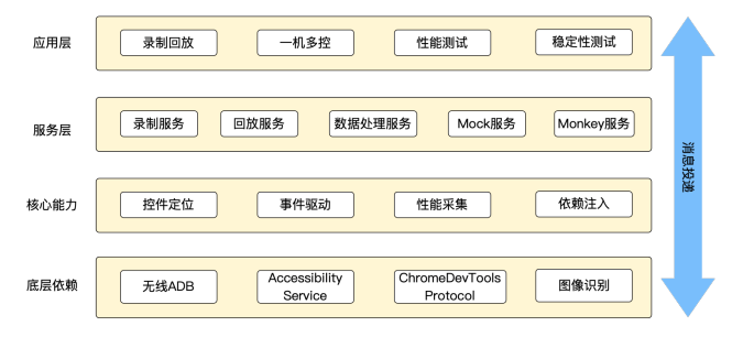 这套方案中,底层依赖主要是“无线 ADB、系统辅助功能、Chrome 调试以及图像识别技术”,后文将会介绍它们具体的应用场景。同时,在底层依赖的基础上,我们封装了一套核心能力,由“控件定位、事件驱动、性能采集以及依赖注入”组成,并在服务层实现了录制、回放、数据处理等公共服务能力。在架构的最顶端,结合界面交互逻辑包装出了各个功能的入口。