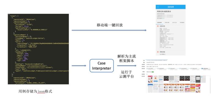 通过 Soloπ 录制的用例会以 JSON 的形式存储起来,用例不仅可以向上述视频演示的一样在设备本地直接回放,还可以通过 Soloπ 的解析器将用例转换为 Appium、Macaca 等目前主流自动化测试框架的脚本,轻松打通云测平台。另外,得益于文本抓取和图像识别能力,Soloπ 还实现了在 Android 端录制一遍用例,生成的脚本能够同时在 Android、iOS 双端回放的能力。