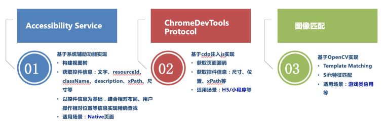 第二种方案基于 Chrome 的调试协议,通过注入js可以获得页面布局以及各元素属性,控件的定位思路与辅助功能这一套方案是一致的。适用于 H5/小程序场景。