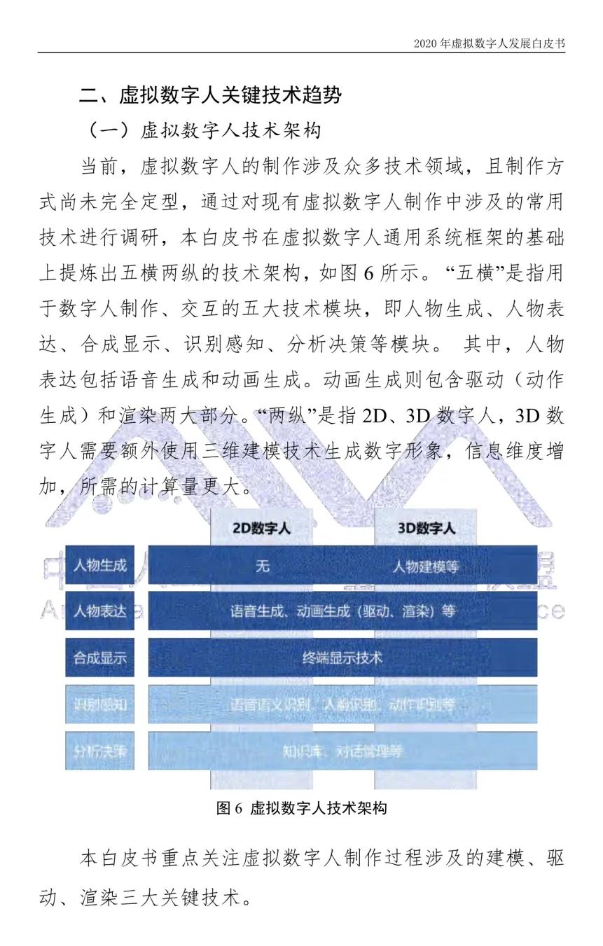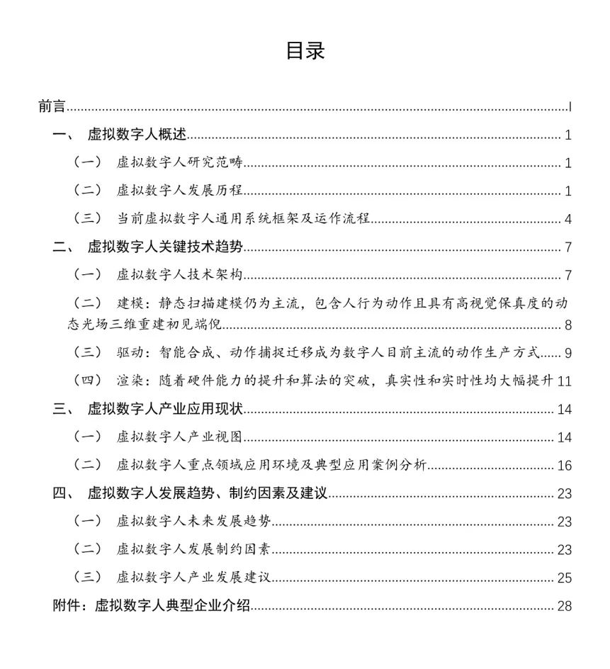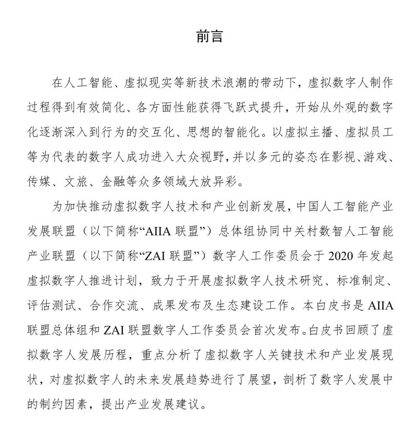 本白皮书是 AIIA│ 联盟总体组和ZAI联盟数字人工作委员会首次发布。白皮书回顾了虚│拟数字人发展历程,重点分析了虚拟数字人关键技术和产业发展现状,对虚拟数字人的未来发展趋势进行了展望,剖析了数字人发展中的制约因素,提出产业发展建议。
