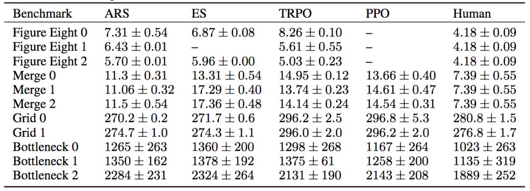 一旦我们制定好了基准,我们就要确保研究人员有一组基准值来检查他们的算法。我们执行了一个小规模的超参数扫描,然后将找到最佳超参数提供以下RL算法运使用:增强随机搜索,近端策略优化,进化策略和信任区域策略优化。